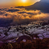 之后便是看【元阳梯田日落】的最佳时间哦!当夕阳缓缓西沉,金色的阳光斜洒在层层叠叠的梯田之上,每一块田地都像是被精心镶嵌的金色鳞片,闪耀着温暖而耀眼的光芒。