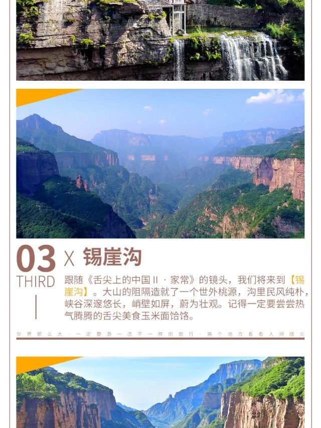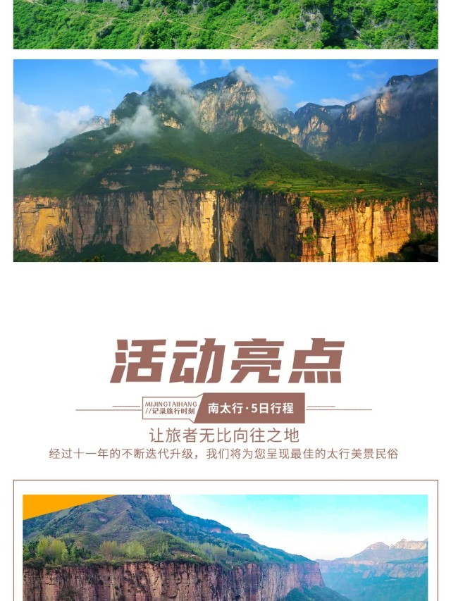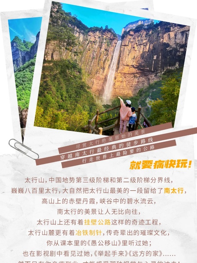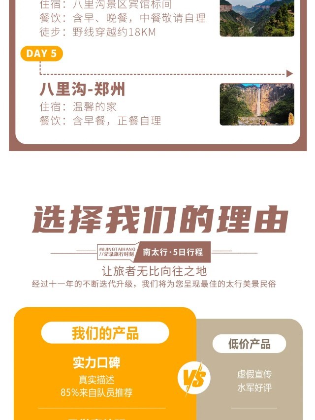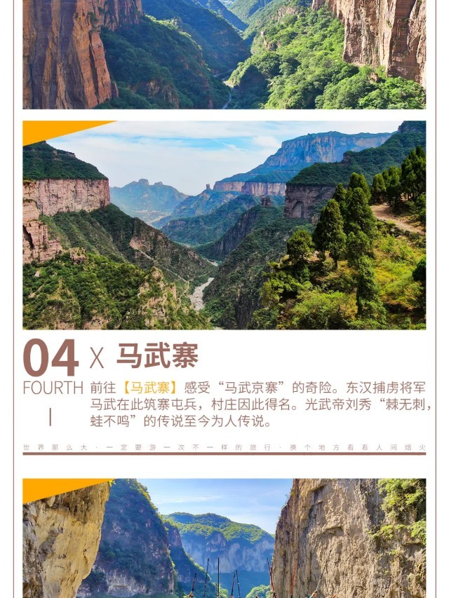 今天可以早早起床,感受一下清晨的【八里沟景区】“太行之魂、中华风骨”的魅力。也可以睡个懒觉,早餐后,大家顺沟而出。一路上,登红岩绝壁,赏峡谷云海,望流泉飞瀑,闻老子布道,更有“仙人迎客峰”欢迎您的到来!山青水秀、碧水丹崖,不愧是号称“北方小九寨”!