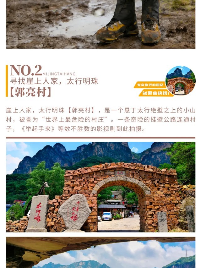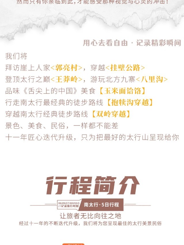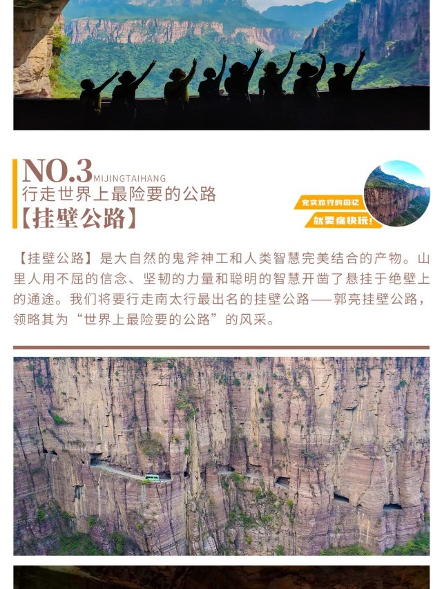 早餐后,出发前往【万仙山景区】。我们将徒步行走这世界第九大奇迹——【郭亮挂壁公路】,亲身感受十三位壮士锲而不舍的精神。站在【崖上人家】观景台上,200余米高的赤红色太行绝壁在你的面前,在你的心里横冲直撞。挂壁公路横挂其上,如梦如幻。来到【炮楼】,远处轿顶山如天宫一般,镶嵌在数百米的绝壁之上,何其壮观。在【天梯】,我们还能看到老一辈郭亮人对外沟通的唯一道路挂在崖壁之上。