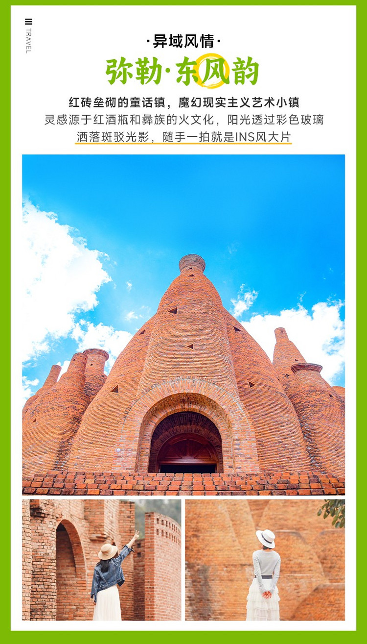 09:00 前往网红打卡地【东风韵小镇】,这是一个集休闲度假、佛教文化、民俗体验、生态观光于一体的艺术小镇。景区内建筑是以本地生产的红砖为主,将三种当地文化混合其中,十分具有设计感,其中酒瓶状建筑代表的是弥勒的红酒文化,还有彝族的火文化和共生向上的文化。