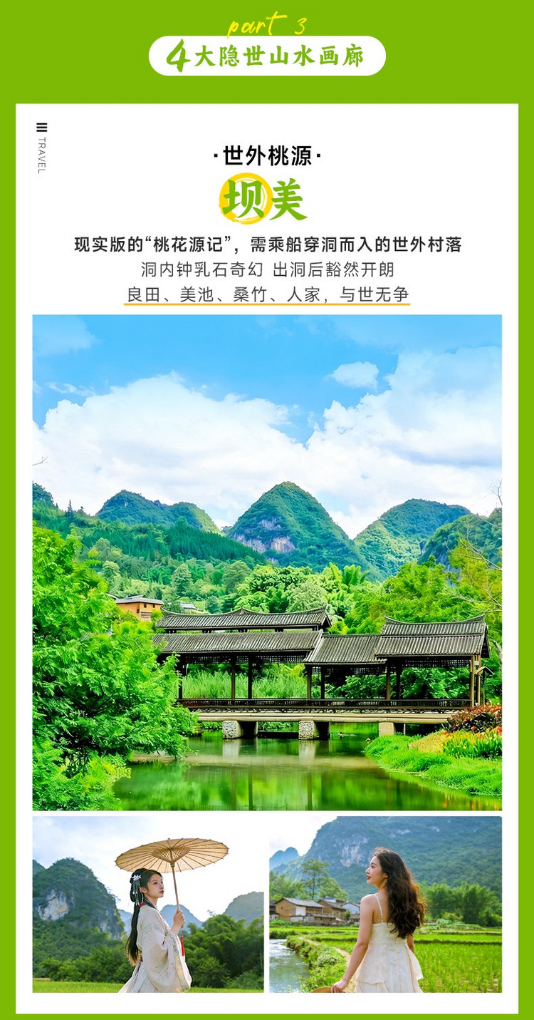 11:30 抵达广南县城,自由享用午餐。午餐后前往【坝美·世外桃源】抵达此地需完成一场仪式:乘船穿过幽暗溶洞,仿佛穿越时光隧道。洞尽天明,古榕、水车与稻田忽然浮现,壮族村落静卧群山怀中。这里是现代版桃花源记的真实注脚,守护着与世无争的农耕光阴。