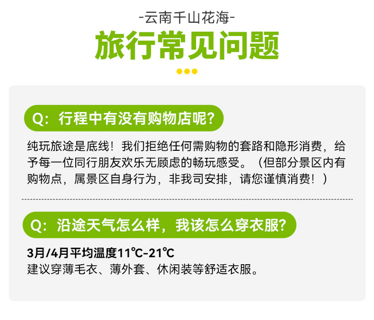 1. 花期每年受气温和气候的变化影响较大,花开及花落日期每年无法固定,无法保证每个团期看到的景色皆为盛花期,请大家保持平常心对待;