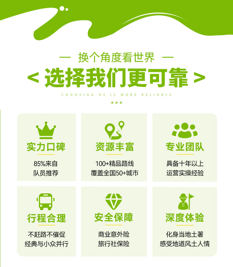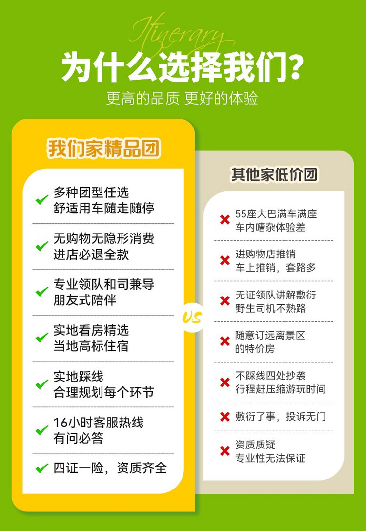 14、行程中司机、领队等工作人员拍摄的照片或者视频有可能会用于我司宣传线路之用,无其他用途;如您介意可联系我司第一时间删除,保证您的权益。