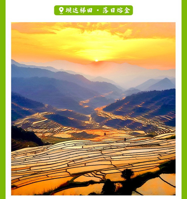 15:30抵达元阳后沿途欣赏【箐口民俗村】,【老虎嘴梯田】。随后前往等候【坝达日落】,前往等候【坝达日落】,夕阳西下满天红霞的时候,站在坝达,千年梯田就在脚下向远处延伸,镜面般的田面反射着霞光,笼上暖暖的金色,衬托出柔美的曲线,不得不感叹人与自然的鬼斧神工。