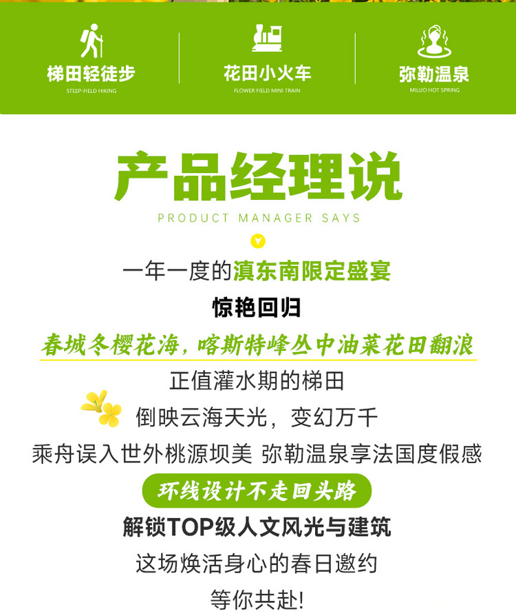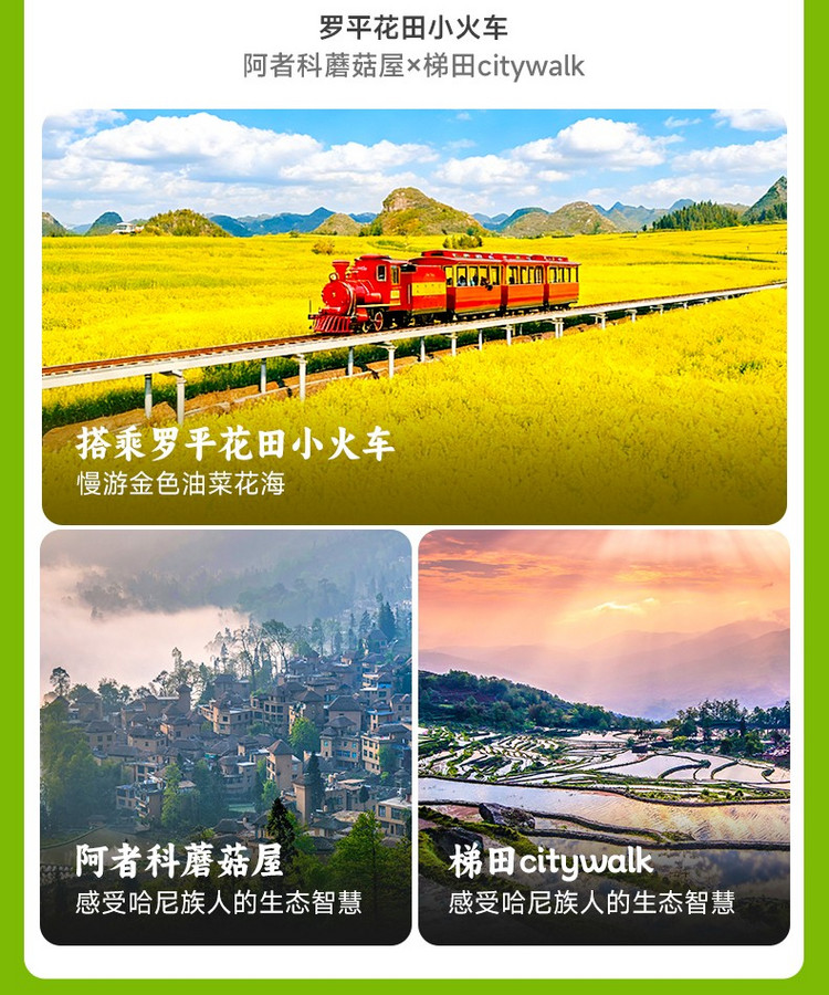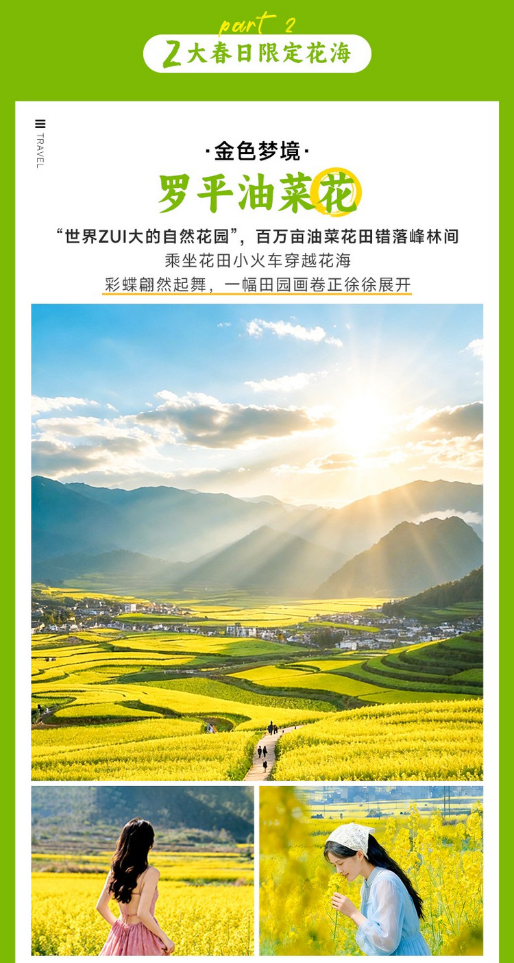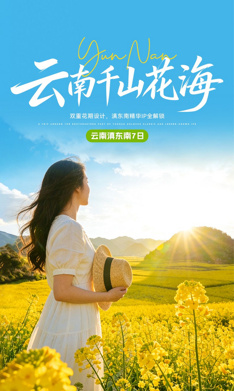 16:00 抵达【罗平油菜花主会场】。罗平有两项“油菜花之最”,一是有国内最早的油菜花季,一般从每年二月初开始,持续到三月底四月初,是年初赏花的著名油菜花旅游目的地。二是罗平是吉尼斯世界纪录认证的“世界最大的自然天成花园”,这个花园最多的花自然是油菜花,光是连成片的油菜花就达二十万亩,被称为油菜花海也不为过。我们在这里为大家赠送【花田小火车】体验,在油菜花海留下一次难忘的回忆。