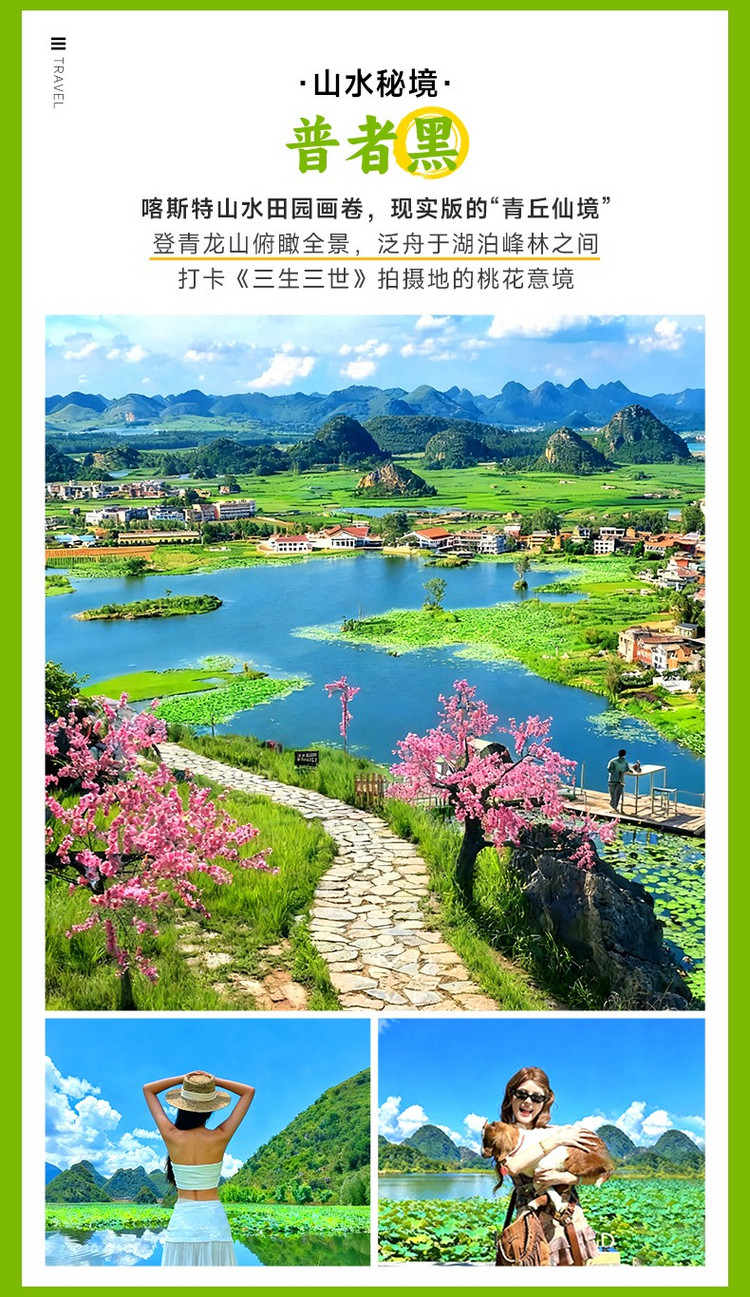 17:30到达【普者黑】,水上峰林如青黛浮于碧波,这里是滇东南的喀斯特山水诗篇。乘一叶柳舟穿行万亩荷塘与溶洞暗河,船桨搅碎云影,惊起白鹭。【青龙山】登顶不过二十分钟,却足以换取俯瞰普者黑全景的“上帝视角”。峰林、湖泊、村落与阡陌在脚下铺展如立体画卷。日落时分,彝家村寨升起炊烟,这片大地用最纯粹的田园水墨,定义着真正的“世外”之境。