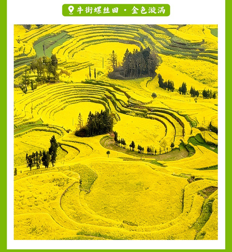 13:30 前往【螺丝田油菜花】。牛街“螺丝田”是由串珠岩溶漏地质地貌构成的自然景观,漏斗如此密集,形态如此奇特,目前尚不多见。这里的梯田是圈状的,远远看去像是螺丝上的旋纹。沿着梯田一圈圈往上延伸的油菜花,像无数金龙盘卧。