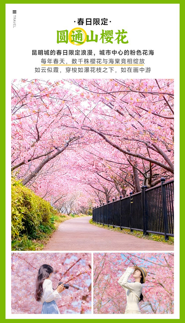 09:00 抵达【圆通山樱花】,每年初春,一场盛大的“粉色风暴”便会如期席卷圆通山。 数千株云南樱花与垂丝海棠沿山势竞相怒放,将整片山野渲染成一片如梦似幻的绯云。花潮之下,游人如织,踏青赏春的欢愉与漫天飞舞的花瓣共同酿造出昆明城中最具生命力的春日盛宴,短暂而绚烂。
