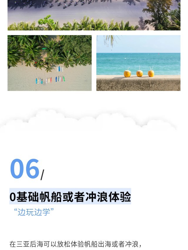 下午:午餐后乘车前往后海渔村,换上泳衣,登上帆船,跟随船长一起扬帆出海。在海南之旅的最后,跟大海进行拥抱告别,追逐日落和晚霞,为本次海南之旅画上圆满的句号。