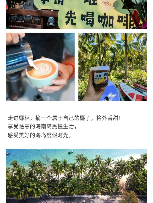 上午:餐后收拾行李,乘车前往椰子洲岛,开车经过本地村庄,在当地的阿哥的带领下,一起去椰徒步穿过椰林小道,抵达椰子岛营地,体验新鲜的椰子鸡。