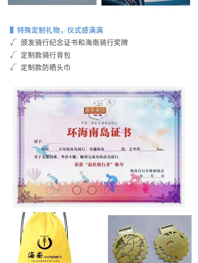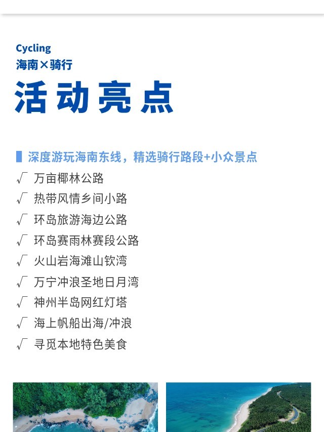 下午:餐后收车,乘车前往日月湾冲浪圣地,打卡国际冲浪比赛的地点,这里是集休闲度假潮人聚集地,新晋网红点。海边颁奖仪式,结束骑行体验开启海岛最后的休闲时光。
