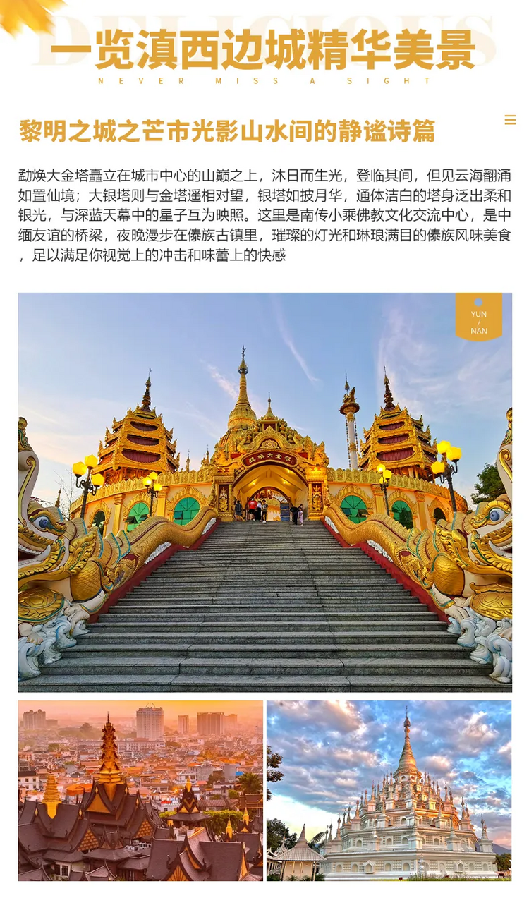 游览完瑞丽口岸后前往总佛寺,体验不一样的南亚风情建筑,这里的佛教文化历史悠久,也是中缅佛教文化交流中心,天气好的话还可以看到醉美日落晚霞。晚上入住这个中国南大门的边陲小城。