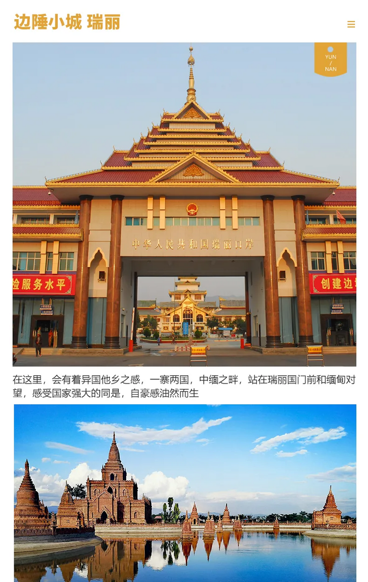 中餐后前往中国南大门的中缅边境--姐告口岸,感受祖国的庄严的姐告国门。姐告是中国西南最大的边贸口岸,中国唯一的一条两国街“中缅一条街”,它是中国320国道的终点,对面是缅甸的木姐市,有着“天涯地角”之称。