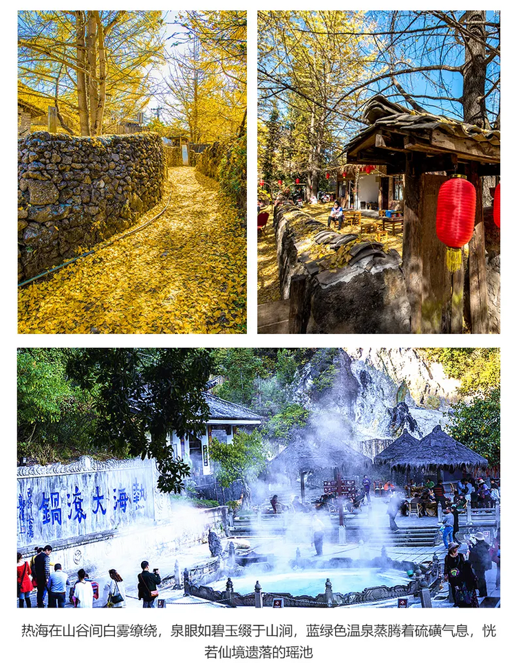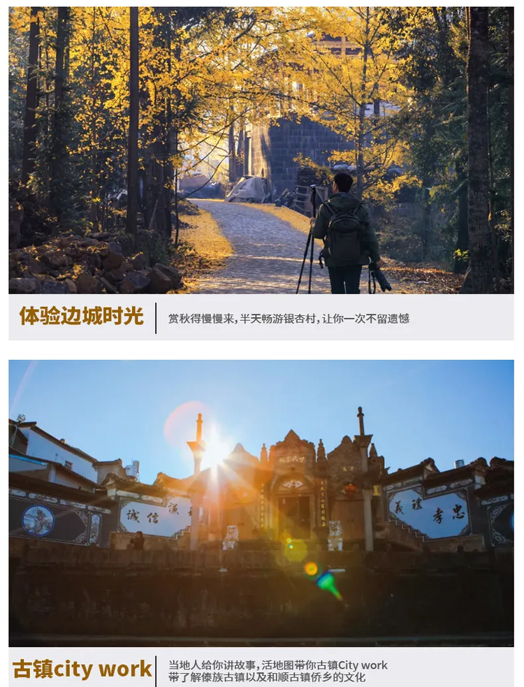 银杏季11-12月份行程:早餐后前往固东镇银杏村,约1小时抵达景区,随后进入银杏村进行疯狂摄影创作。这里,是宛如天堂的静谧秋景;这里,是电影《武侠》的拍摄地;这里,是秋季里的金色梦想;这里村在林中,林在村中相互依托。这里,便是天下第一银杏王国《腾冲银杏村》。游人身临其境,仿若走进金色的童话世界。午餐特大家可以AA品尝当地特色农家乐【银杏宴】,但需提前预订哟。
