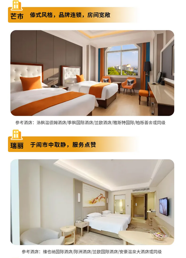 早上8点酒店早餐,早餐后从酒店出发沿杭瑞高速途经保山前往芒市【黎明之城】,车程约4小时。中午抵达芒市后自行用午餐,推荐德宏景颇当地绿叶宴,值得一尝。午餐后可以先行办理入住,随后前往游览傣式建筑风格的勐焕大金塔,金塔矗立在城市中心的山巅之上,沐日而生光,登临其间,但见云海翻涌,如置仙境;大银塔则与金塔遥相对望,银塔如披月华,通体洁白的塔身泛出柔和银光,与深蓝天幕中的星子互为映照。这里是南传小乘佛教文化交流中心,是中缅友谊的桥梁;傍晚漫步在傣族古镇里进行一次傣族古镇City work,当地活地图带你感受古镇韵味;