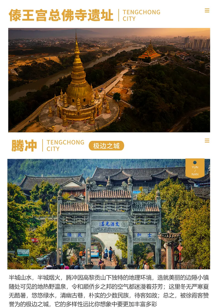 3、门票:行程内所列景点门票(芒市大金塔、大银塔、一寨两国、和顺古镇、热海景区含电瓶车、银杏村含电瓶车/高黎贡油菜花基地/火山景区3选1);