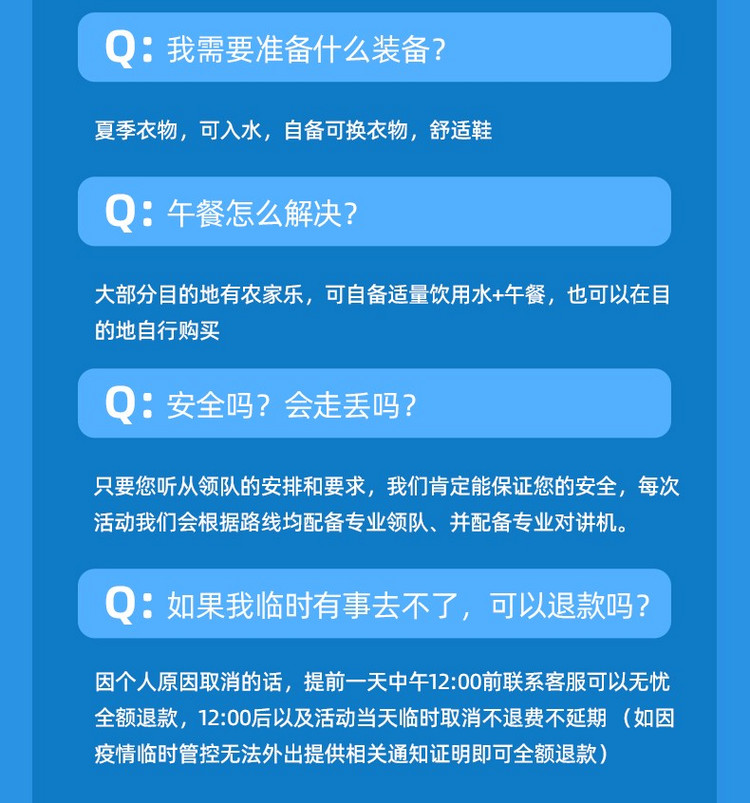 活动出发前1天中午12点之前可全额退款,前一天12点之后扣除50%活动费用,前一天20点后不可退费!如活动未成团,出发前一天系统自动退款到原支付账户。