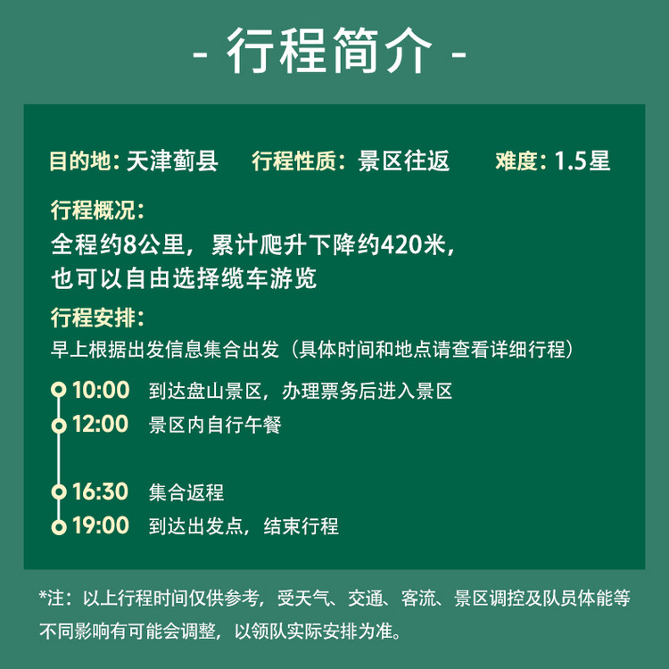 注:以上时间为正常安排时间,如遇天气、道路堵车、景区管控等外在因素影响,以领队安排为准。