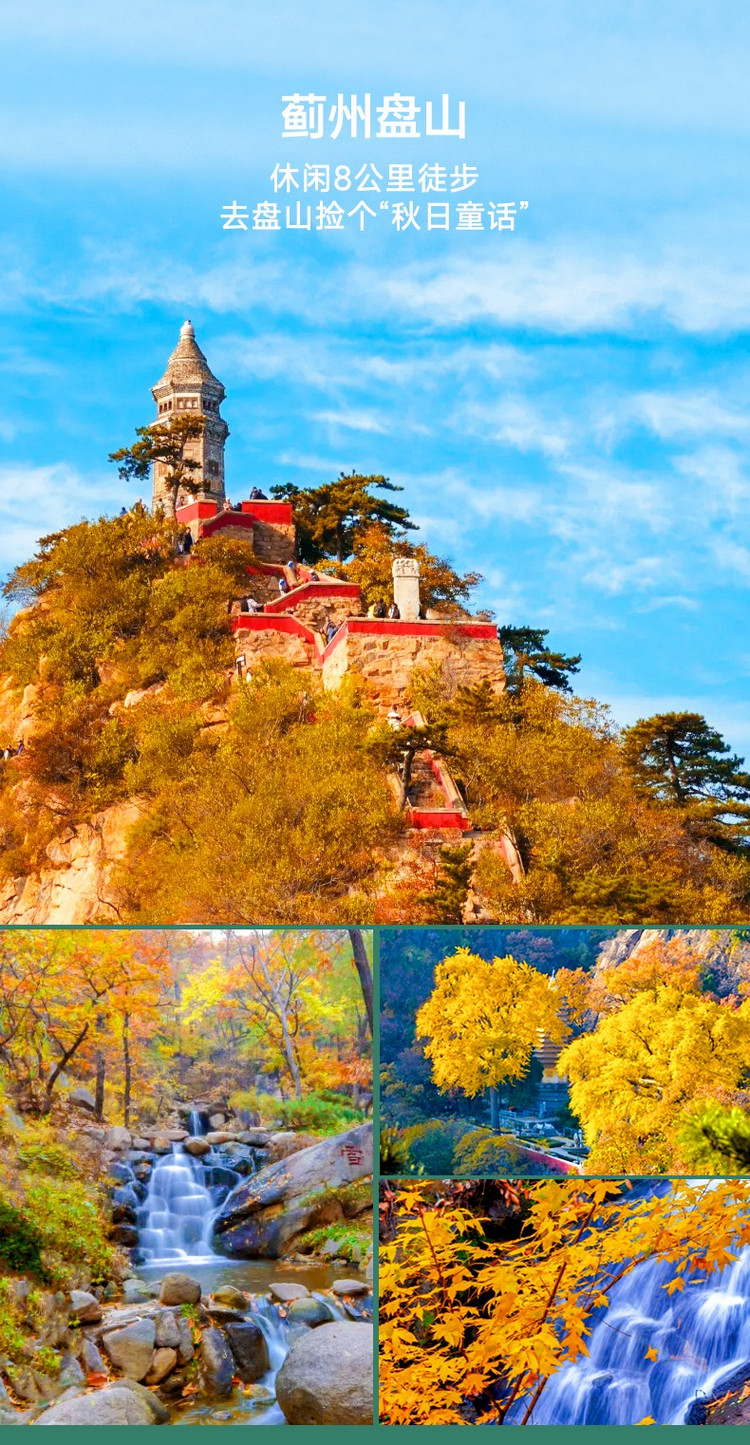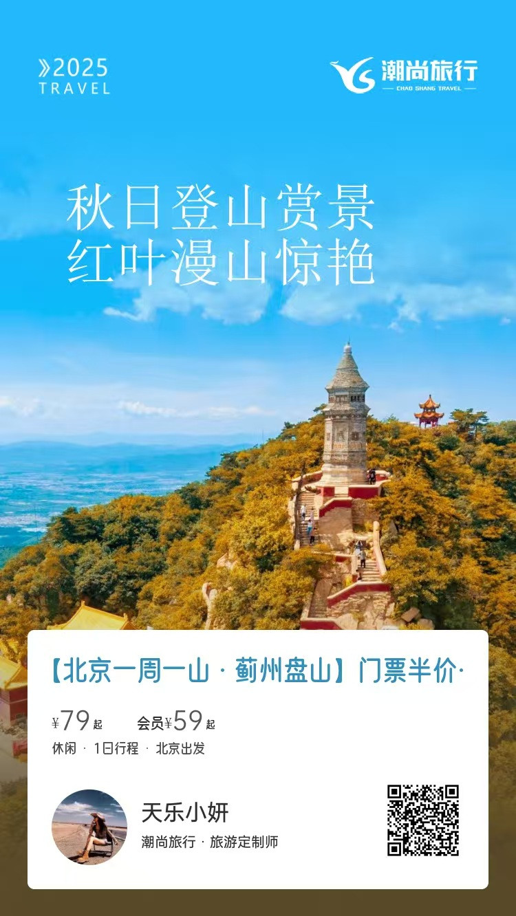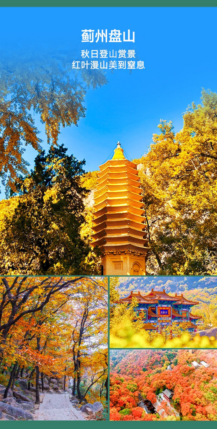 10:00 左右到达盘山风景区后,自由登山赏秋摄影,您可选择徒步游览盘山精华赏红叶线路,也可乘坐缆车盘山全景游;盘山的秋天是一场视觉盛宴,层林尽染如流动的画卷。漫步蜿蜒步道,看枫叶飘落如舞者谢幕,听溪水倒映彩林如镜中世界。枫叶红得似火,银杏黄得如金,松柏依旧苍翠挺拔,三色交织,宛如调色盘被打翻在天地之间。此时登高望远,山峦起伏如波浪般延展,云雾缭绕其间,仿佛步入仙境。
