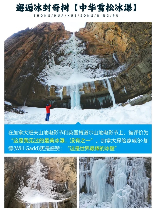 随后,我们进入仙霞谷,沿着峡谷冰挂一路向上,来到峡谷尽头。终于见到天然形成的【中华雪松(圣诞树)】简直酷毙了!它高达140多米,举世无双。纪录片《寻找圣诞树》在加拿大班夫山地电影节和英国肯道尔山地电影节上放映时,评价其为“这是我见过的最美冰瀑,没有之一”。加拿大探险家威尔·加德(Will Gadd)更是盛赞:“这是世界最棒的冰壁”。