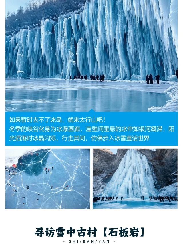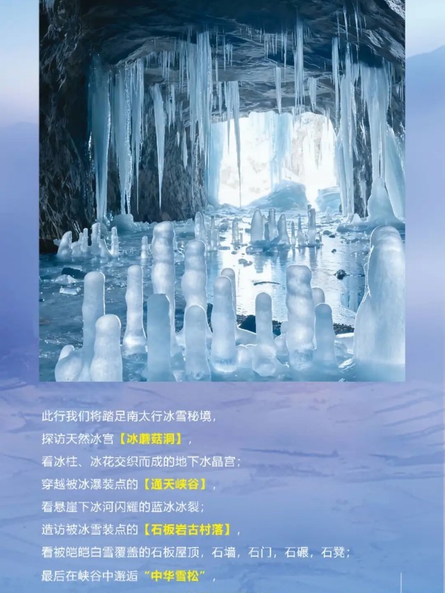 早餐后,出发探访太行山冬季限定的自然奇观——【冰蘑菇洞】。她是由山泉漫流、滴水穿石,在特定地貌与严寒气候下共同雕琢出的地质杰作。