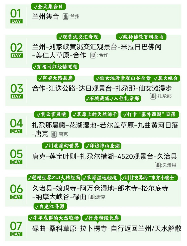 今天为全天集合日,我们相聚在兰州,出发前三天短信通知集合酒店。领队会在出发前一天下午18:00前联系您。到达酒店报【甘南自驾+姓名】入住酒店。