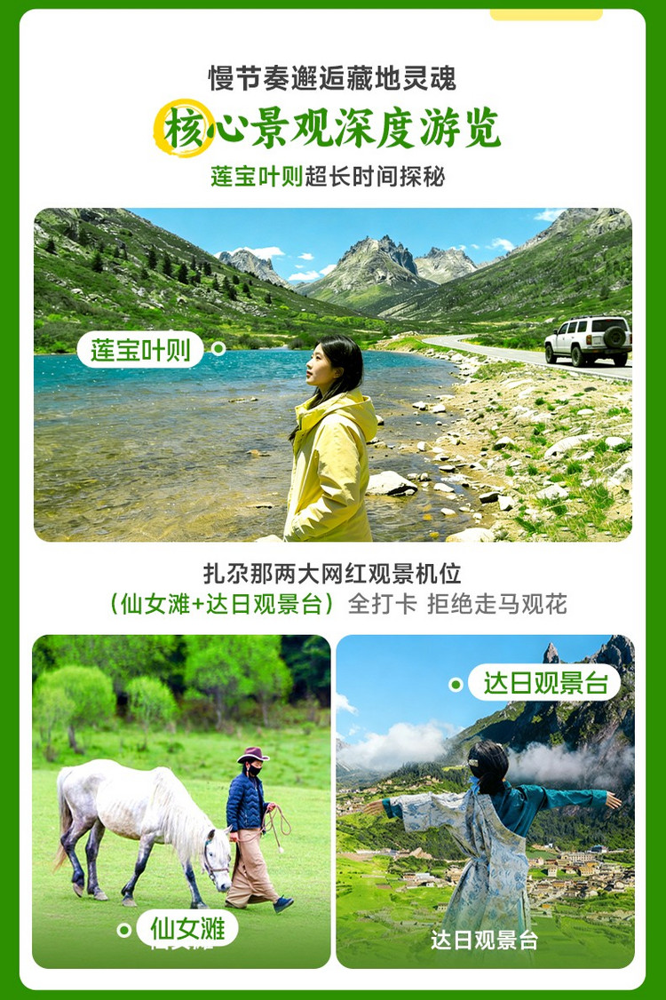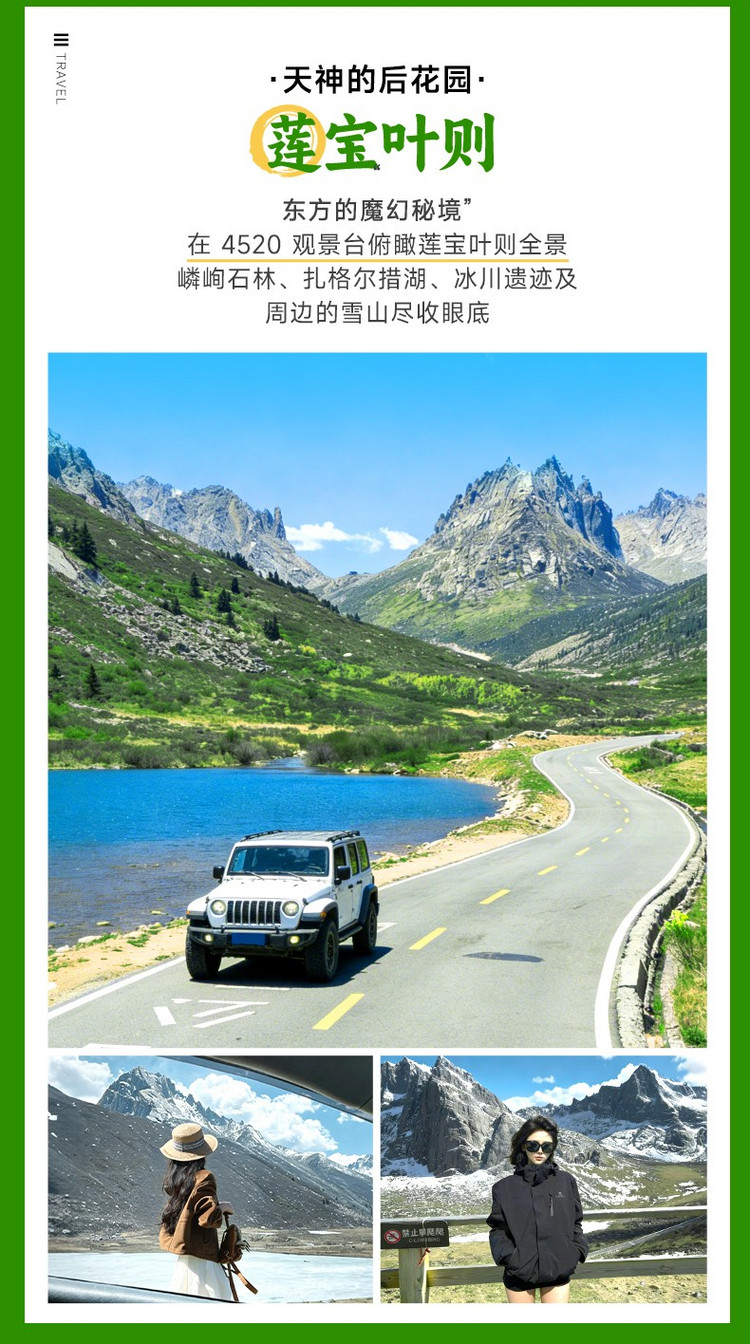 早餐后,我们进入中国ZUI具潜力的秘境美景【莲宝叶则】(游玩约4-5小时)。莲宝叶则风景区山峰平均海拔在4000米以上,是藏区著名的神山。莲宝叶则藏语意为:尊严的玉石之峰。其内奇峰兀立,云雾缭绕,湖泊星罗棋布。我们将徒步至海拔4250米的【扎尕尔措湖】,欣赏圣湖与刀劈斧削的冰川角峰的完美结合,并挑战【4520观景台】,将这片雄伟奇崛的石山镜湖尽收眼底。