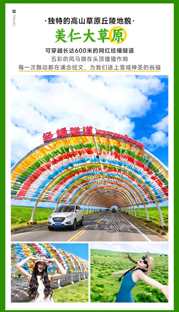 随后前往【美仁大草原】(游玩约2小时),一路风景如画,牛羊成群悠闲自得,座座帐篷如明珠般镶嵌在碧绿的草地上,呈现在你眼前的每一幅景观几乎都似是Windows的桌面一般,令人心情无比舒畅。这里的草原和别处不一样,它的表面是一个个隆起的小草包,这正是它独有的冻胀丘地貌。这里也拥有长达长达600米的网红经幡隧道,拍照非常出片。