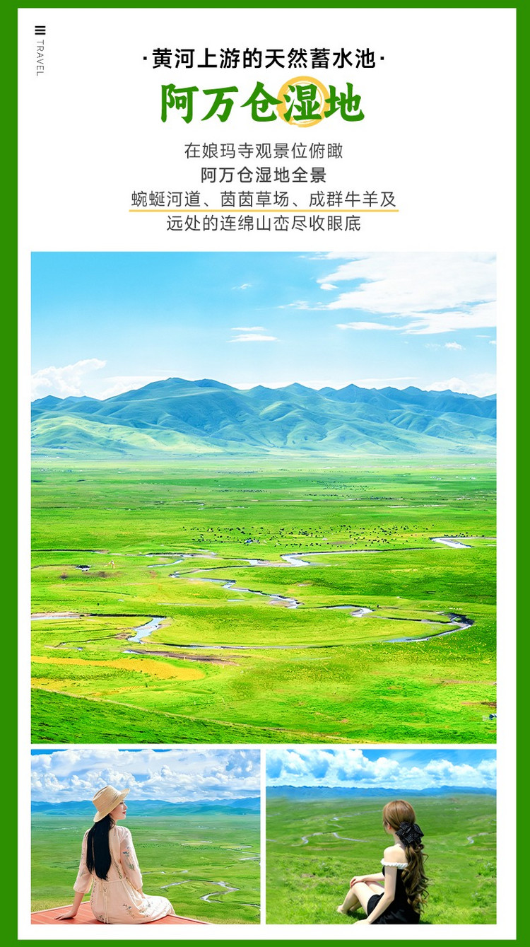 游览结束后,前往【阿万仓湿地】(游玩约2小时),阿万仓湿地被《中国国家地理》评为“中国ZUI美的五大草原湿地”第一名,美国旅游杂志《视野》“让生命感受自由”的世界50个户外天堂之一。阿万仓就坐落在黄河第一湾的臂弯里,河流与黄河汇流之地,水泻不畅形成的汉河和沼泽,滋润着这片广袤的草原,高山、湿地、草原,汇成了一幅壮丽的自然画卷。
