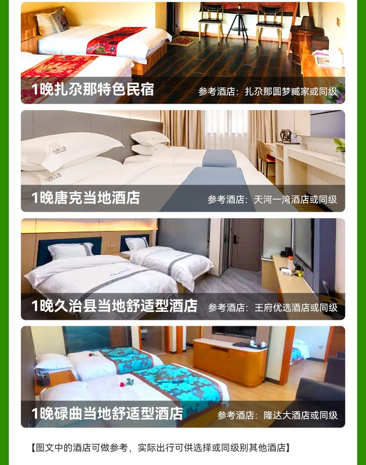 行程中的所列的酒店类型,2星/2钻=经济型;3星/3钻=舒适型;4星/4钻=高档型;5星/5钻=豪华型;意为评定或条件到达相应标准的酒店,少部分地区,由于政策等因素,可能存在酒店条件满足,但未进行星钻评定的情况。