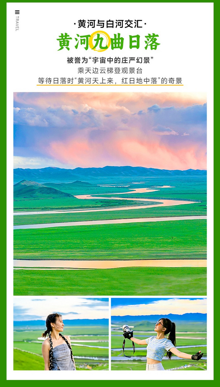 下午,前往【九曲黄河第一湾】(游玩约2-3小时),这里是黄河唯一流经四川的段落,形成"S型"绝美弯道。乘扶梯上山顶,看夕阳将九道弯染成金色,被誉为"宇宙中ZUI浪漫的曲线"。在黄河栈道:近距离拍摄水流与草原,也可以前往红教寺庙,可俯瞰黄河全景!