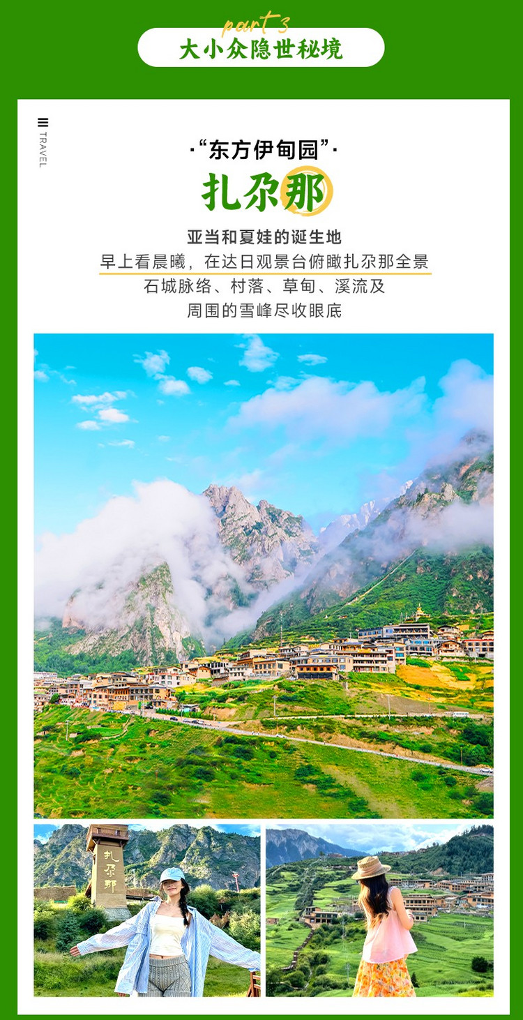 扎尕那山势奇峻、景色优美,地形犹如一座规模宏大的巨型宫殿,又似天然岩壁构筑的一座完整的古城,这片世外桃源早在近百年前就被洛克誉为亚当和夏娃的诞生地。