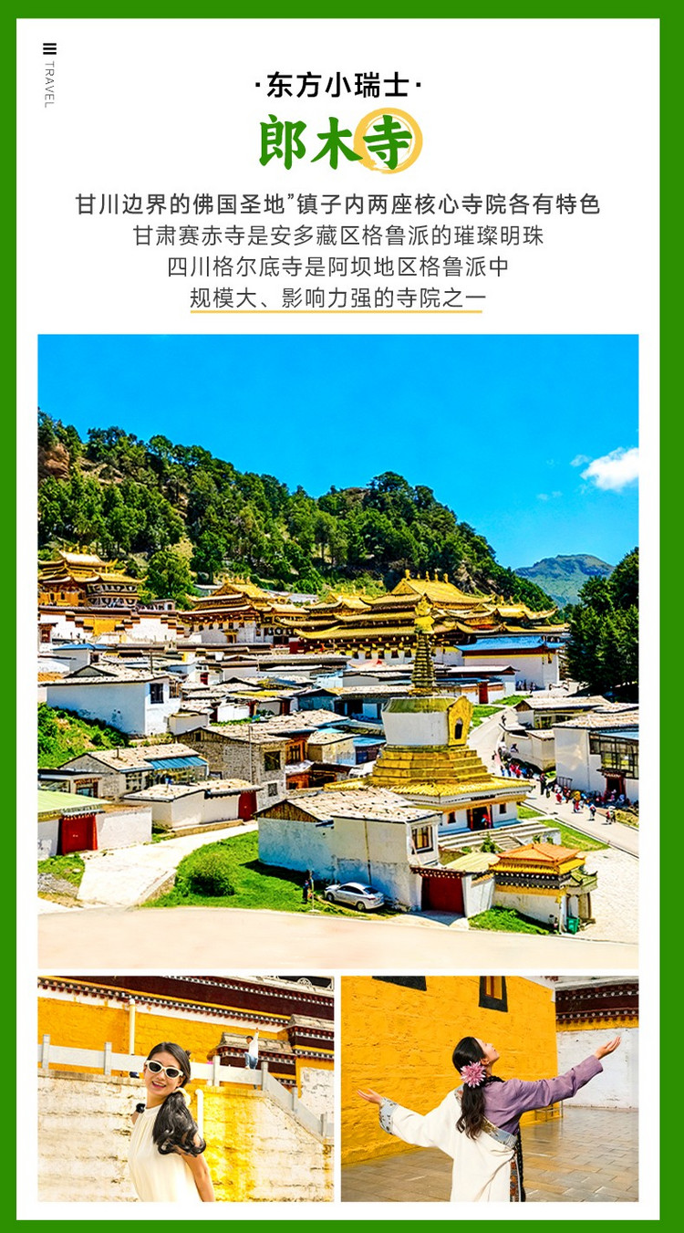 适时前往“东方小瑞士”【郎木寺镇】,步入四川境内的【格尔底寺】,其内供奉着百年不腐的活佛肉身,有佛缘即可参观。