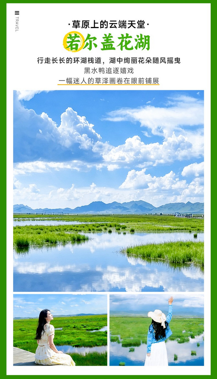 早餐后,我们前往【若尔盖花湖】(游玩约3-4小时),镶嵌在川西北高原的“天空之镜”,是中国ZUI美的湿地明珠之一。夏季来临,3000余亩的湖面化作缤纷花毯,狼毒花、格桑花与鸢尾花在碧水间肆意绽放,黑颈鹤优雅掠过如镜湖面,留下圈圈涟漪。木质栈道蜿蜒深入湿地,倒映着流云与远山,仿佛行走在水天交界处。秋日水草泛金,冬季冰晶凝玉,四季轮回间始终保持着遗世独立的纯净。