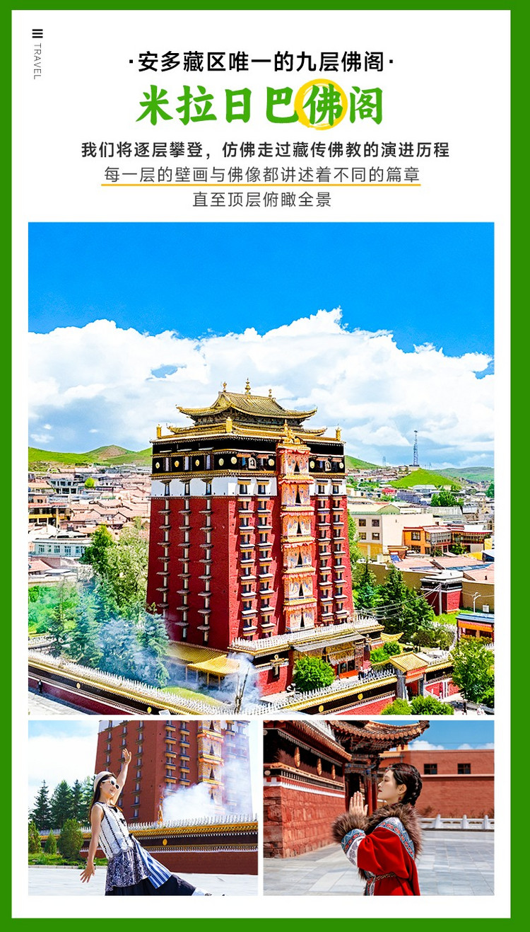 接着前往【米拉日巴佛阁】(游玩约1小时),这里是藏区供奉藏传佛教各派宗师的名刹。米拉日巴佛阁楼高共九层,供奉以米拉日巴尊者及其弟子为主的藏传佛教各派的开宗祖师,有以金刚为主的四密乘的众多佛像、菩萨、护法神等各类佛像1720尊。楼内壁画琳琅满目,与彩绘、唐卡、塑像浑然一体,颇具宗教神秘的色彩。