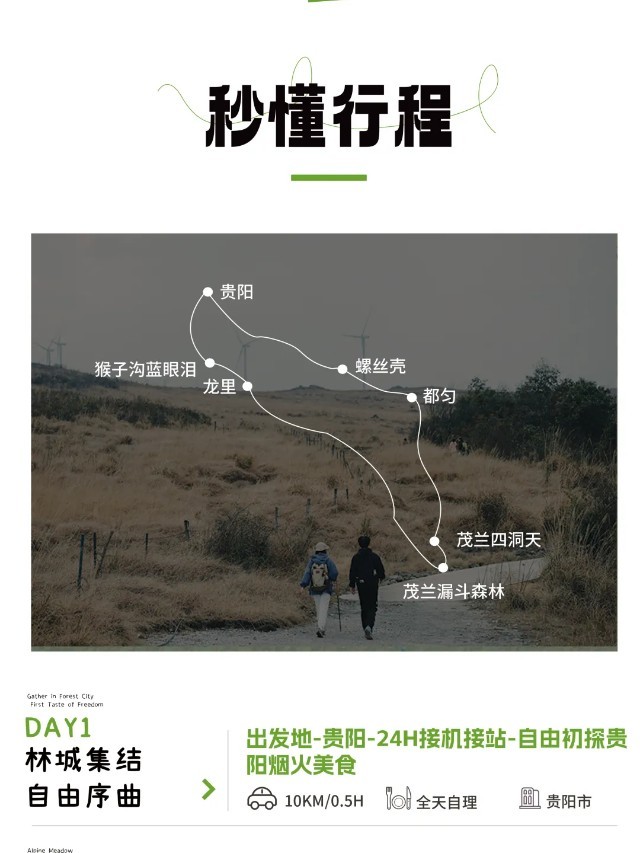 随后穿越密林,豁然开朗处,是一片绵延的高山草原。漫步于此,看巨大的白色风车在湛蓝天空下缓缓旋转,仿佛走进宫崎骏的动画世界。午后,我们怀着满心回忆与美景,乘车返回贵阳,为这次荒野之旅画上圆满句号。