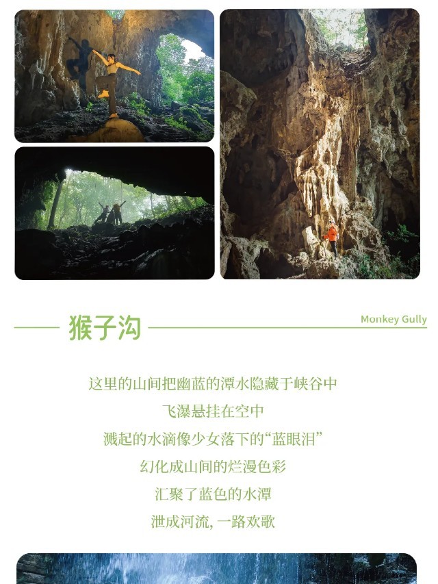 早餐后前往探访深藏于龙里山谷的猴子沟。徒步始于幽静古道,沿着湛蓝如染的河谷行进,水声潺潺相伴。双龙瀑布跃然眼前,双瀑并流,气势清灵。而此行的点睛之笔,是那一潭被誉为“蓝眼泪” 的瑶池秘境——矿物质将池水染成梦幻的蒂芙尼蓝,清澈见底,美得不似人间。