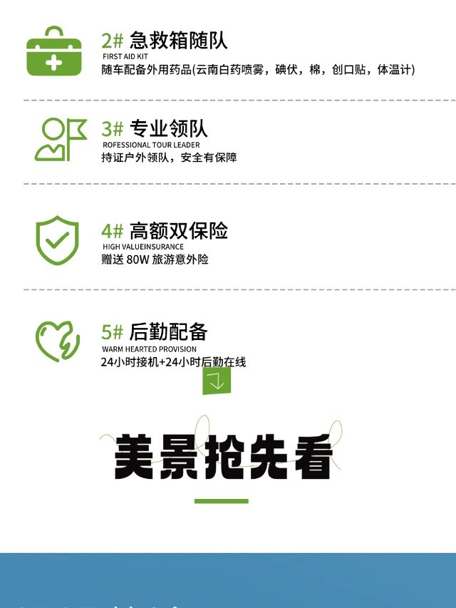 ➀ 保险:赠送80万保额旅游意外伤害保险(未满10周岁儿童最高为20万保额)