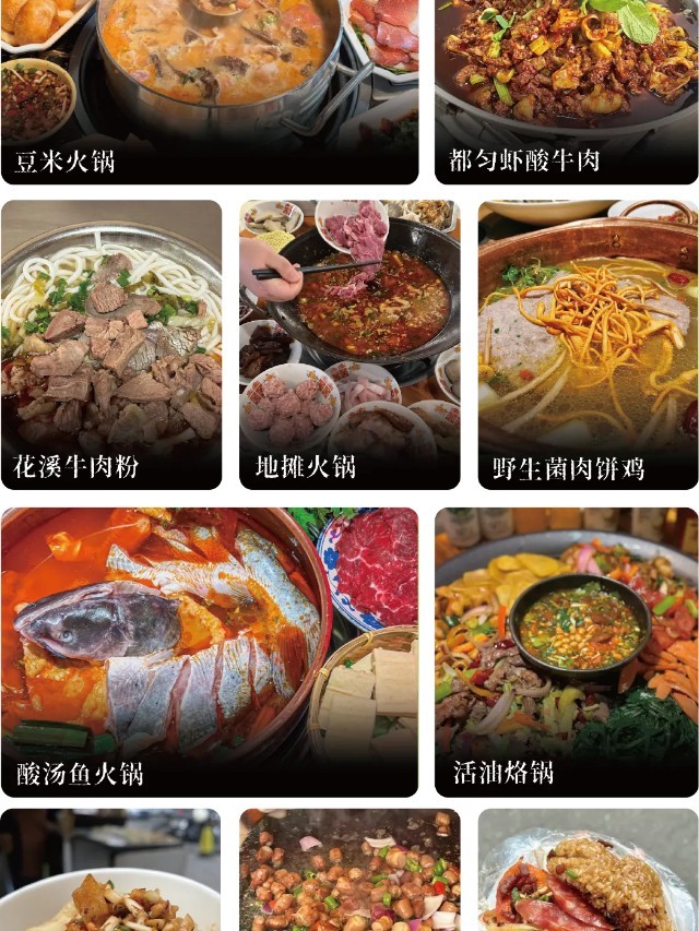 美食小吃推荐:凯里酸汤鱼、酸汤牛肉(新凯里、老凯里、亮欢寨、快活林等)、包整小吃(比较齐全)、丝娃娃、留一手烤鱼、肠旺面、遵义虾子羊肉粉、手撕豆腐、爆浆小豆腐、洋芋粑粑、冰粉等。