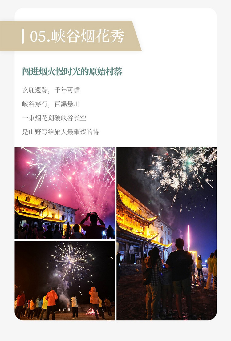 峡谷“ 星空烟花秀” 。一束烟花骤然升空,划破鹿院坪峡谷的静谧长空。星火倾泻而下,与漫天星光交相辉映,