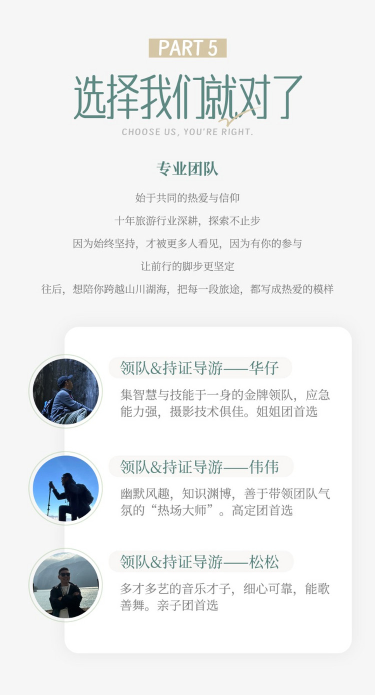 (3)此线路适合5-65周岁旅游者(身体健康,腿脚便利,非大中型手术的恢复期病患者,无传染性疾病、无精神疾病或无严重贫血、无突发性疾病等的户外自然爱好者)报名参加,孕妇不接待;代他人报名者也请核实代报人的身体状况。如果报名者或者代他人报名者隐瞒身体状况,造成的后果,由自己承担;