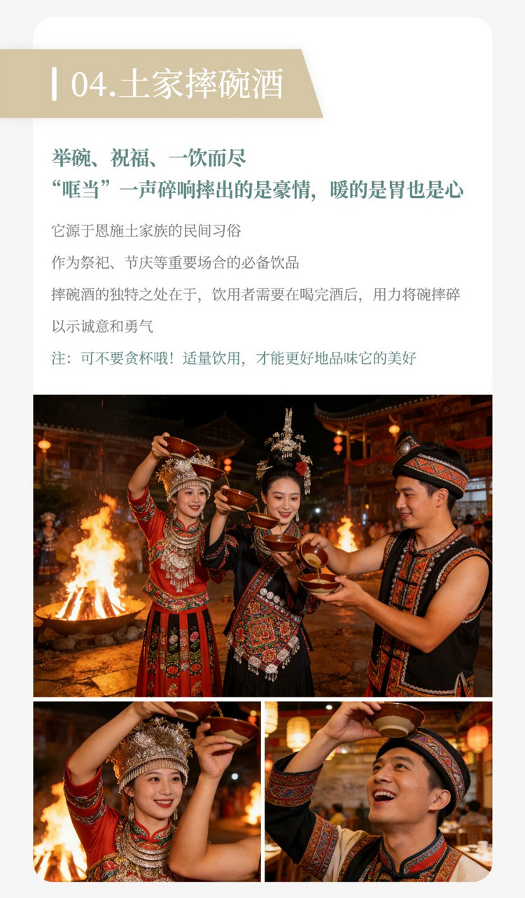 体验“土家摔碗酒”。举碗、祈福、一饮而尽!“哐当” 一声脆响。摔出的是千年土家的山野豪情,暖的是胃,更暖的是心。这一习俗源自恩施土家族古老传统,是祭祀祈福、节庆宴饮等重要场合的待客礼俗。酒尽碗碎,以清脆声响昭显诚意,以洒脱姿态传递勇气,藏着土家人淳朴热烈的处世之道。
