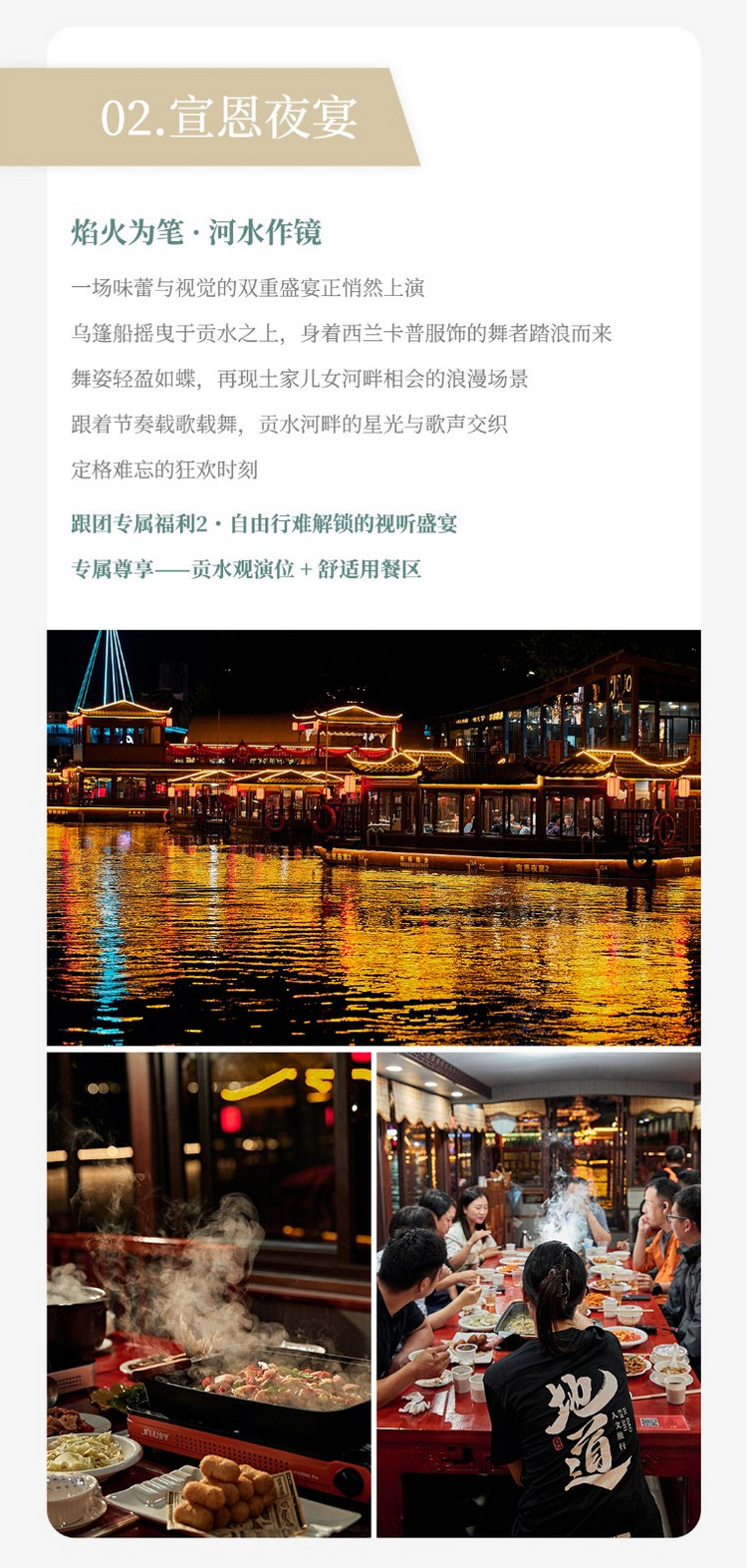 暮色降临,泛舟贡水河畔,边享晚餐边赏宣恩夜景。餐后可自由漫步河畔,沉浸式感受小城的宁静与烟火交织的独特韵味。