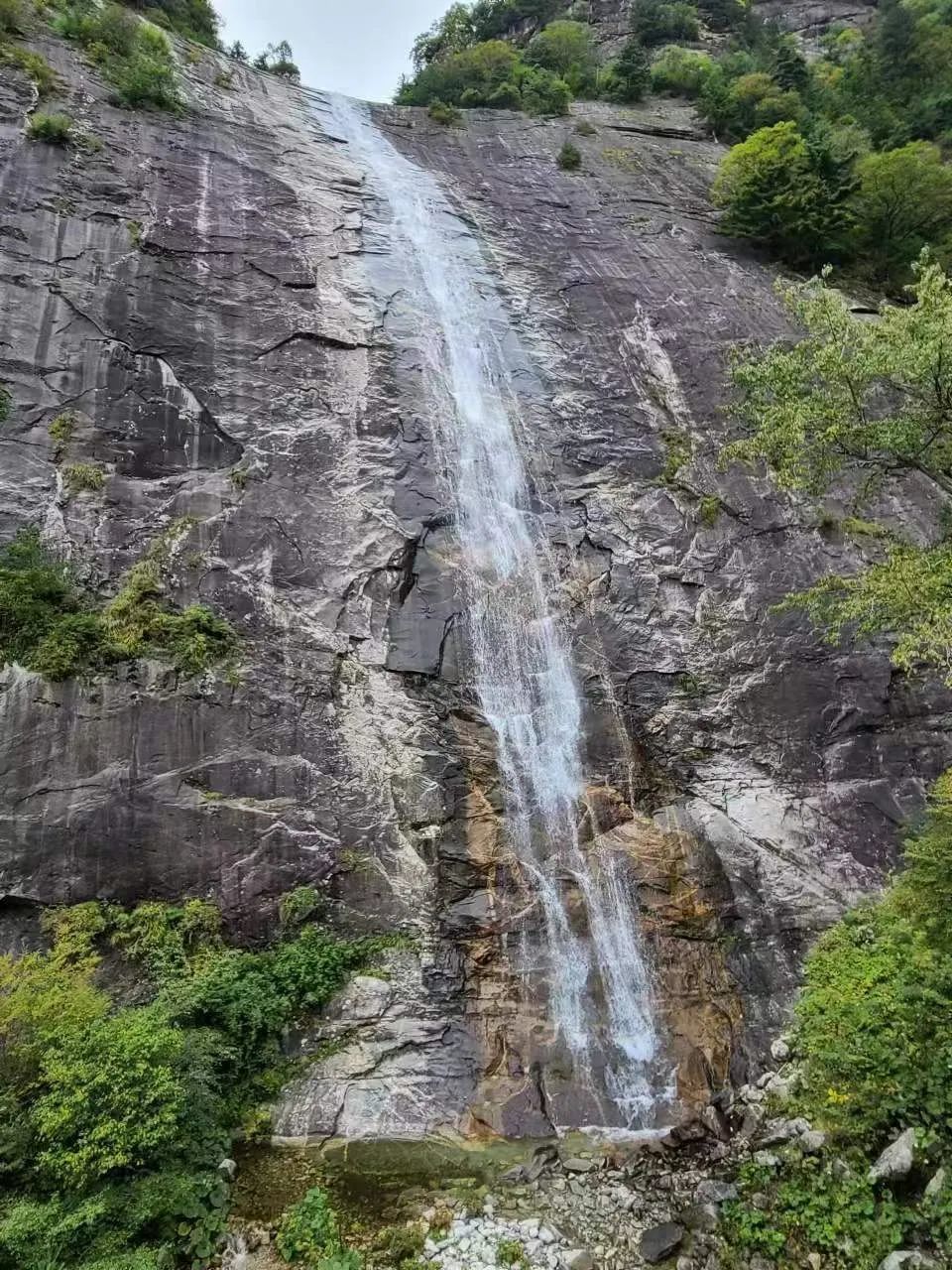 穿过台阶便会看到一条银白色的水练挂在崖壁上