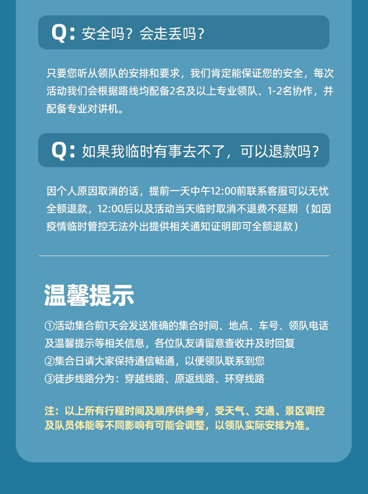 1、若活动因人数原因未成行,将于出发前一天群内告知取消,全额退还费用