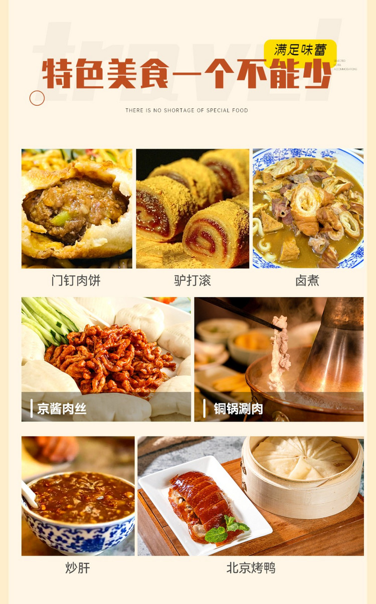 美食推荐:北京烤鸭、老北京炸酱面、老北京铜锅涮肉、爆肚、卤煮、豆汁儿、驴打滚、豌豆黄等等..