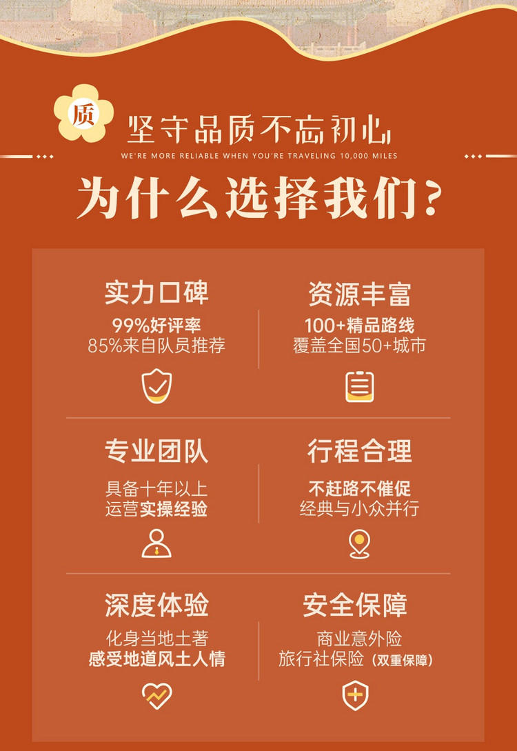 注:行程内时间都为计划时间,如遇暴雨、堵车等情况,具体行程由领队安排。