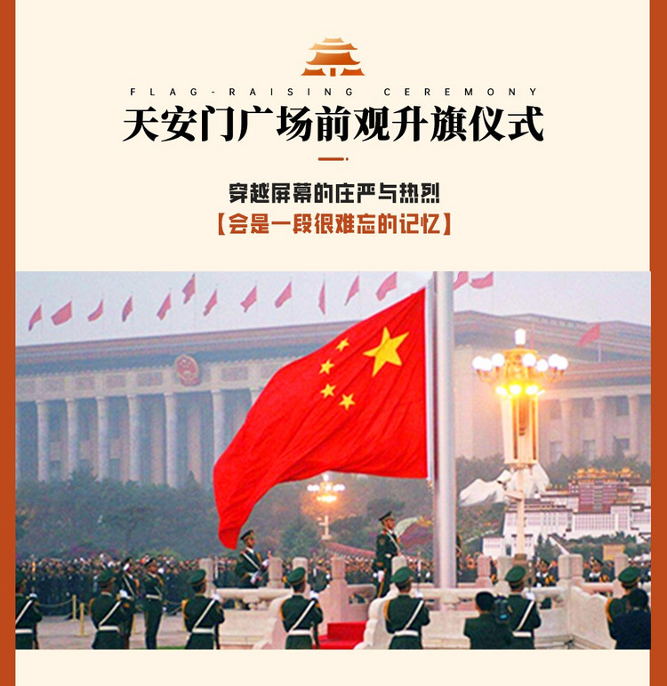 今天早起来到【天安门广场】(游玩时间约1小时)观看隆重的升旗仪式。只见三军仪仗队迈着铿锵有力的步伐,护旗而出,铿锵响亮的脚步声响彻天安门广场。当《义勇军进行曲》奏响,我们都自发的安静下来,只有心中的感动,和身为大国人民的自豪之感。清晨气温较低,大家记得带上外套。
