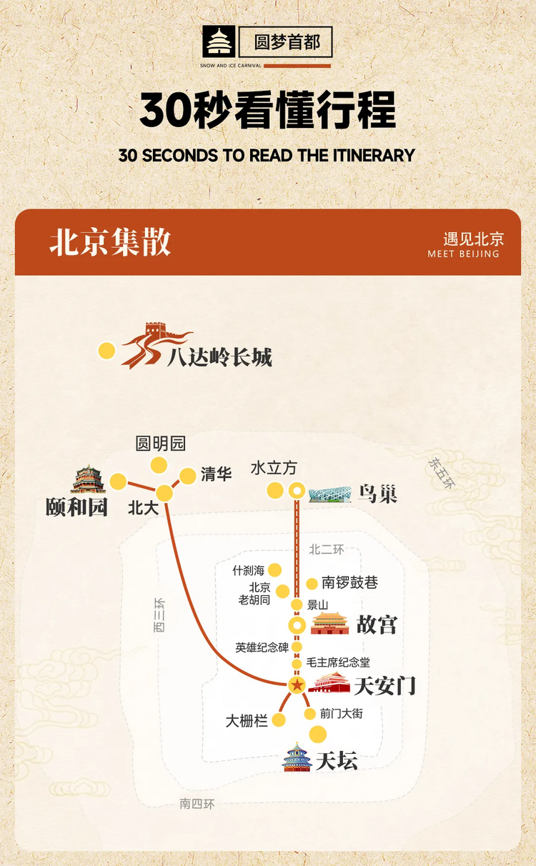 故宫首道大门票、景山公园大门票、八达岭长城/居庸关长城首道大门票(二选一)、圆明园联票、颐和园联票、天坛联票