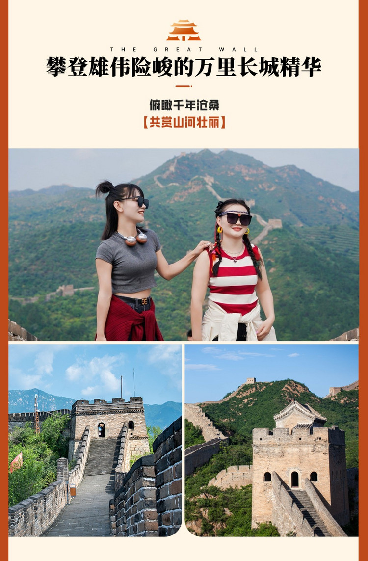 上午7:00 我们乘车前往雄伟的【八达岭长城】或【居庸关长城】(车程约2小时,游玩时间约4小时),开启长城攀登之旅!长城上日照较强,建议大家穿上防晒衣,带饮用水,也可以带一些零食,爬长城了补充体力时吃。